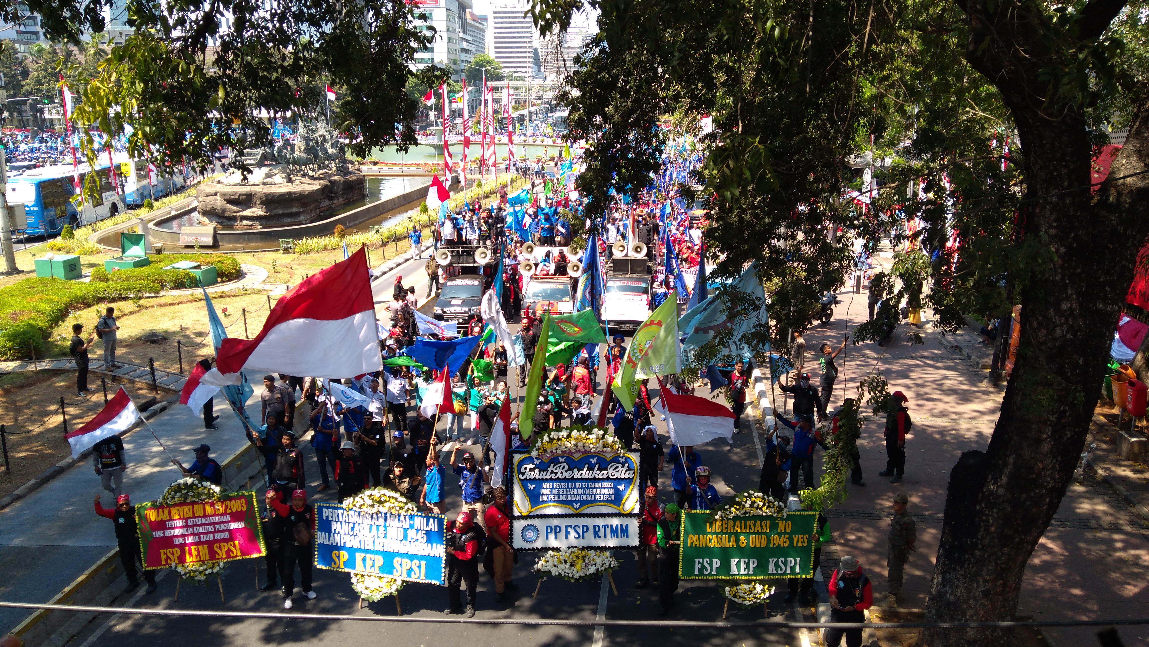 SPKEP-SPSI ORG- Jakarta | Ribuan serikat pekerja yang tergabung dalam Gerakan Kesejahteraan Nasional (GEKANAS) padati Istana Negara Rabu, 21/08/2019 untuk melakukan penolakan terkait revisi Undang–undang 13 Tahun 2003 tentang Ketenagakerjaan. Penolakan tersebut dilakukan karena wacana revisi undang–undang tersebut dianggap akan sangat merugikan para pekerja.