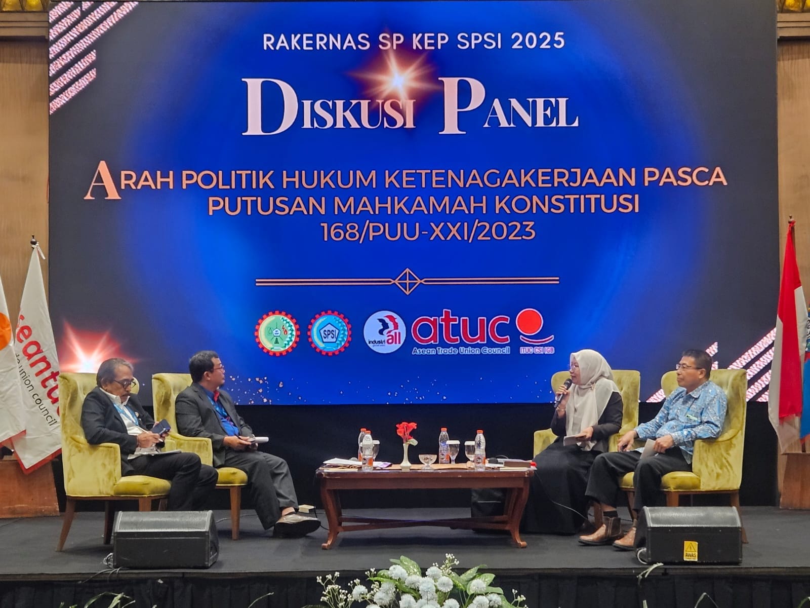 KEPTV | Bandung, 24 Juni 2025 — Hari pertama Rapat Kerja Nasional (Rakernas) SP KEP SPSI Tahun 2025 yang berlangsung dari 24 hingga 26 Juni diawali dengan diskusi panel bertema “Arah Politik Hukum Ketenagakerjaan Pasca Putusan Mahkamah Konstitusi Nomor 168/PUU-XXI/2023.” Diskusi yang berlangsung di El Royale Hotel, Bandung ini menjadi ruang penting untuk menganalisis dinamika hukum ketenagakerjaan Indonesia, khususnya setelah keluarnya putusan MK terkait UU Cipta Kerja.
