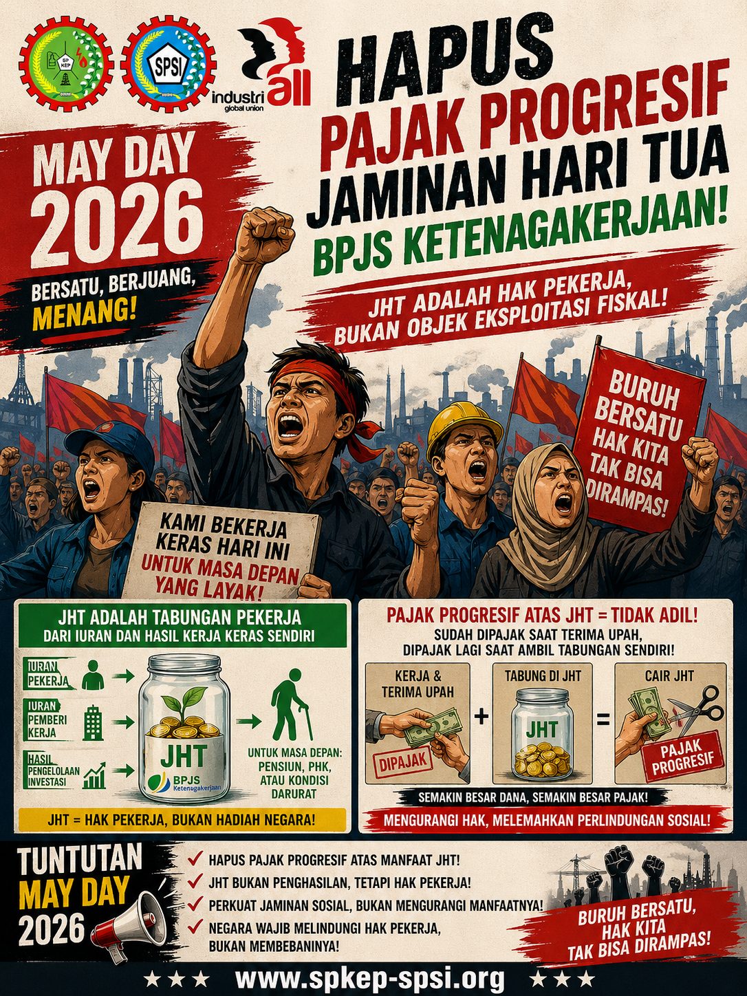 Perayaan May Day 2026 harus menjadi momentum tegas untuk mengoreksi kebijakan yang tidak berpihak pada pekerja. Salah satu isu krusial yang perlu diangkat adalah pemberlakuan pajak progresif terhadap manfaat Jaminan Hari Tua (JHT) yang dikelola oleh BPJS Ketenagakerjaan. Kebijakan ini bukan sekadar persoalan teknis fiskal, melainkan menyangkut keadilan dan penghormatan terhadap hak pekerja atas hasil jerih payahnya.